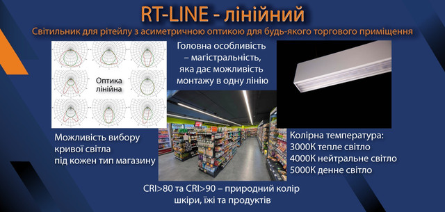 Світильник RT-LINE-570-S з асиметричною оптикою – це стельовий лінійний LED світильник, спеціально розроблений для освітлення магазинів і полиць. Він забезпечує якісне рівномірне освітлення, підкреслюючи товари та привертаючи увагу покупців.